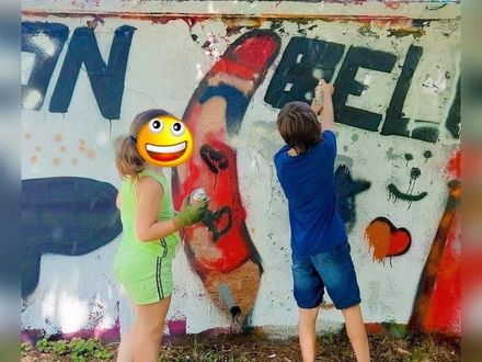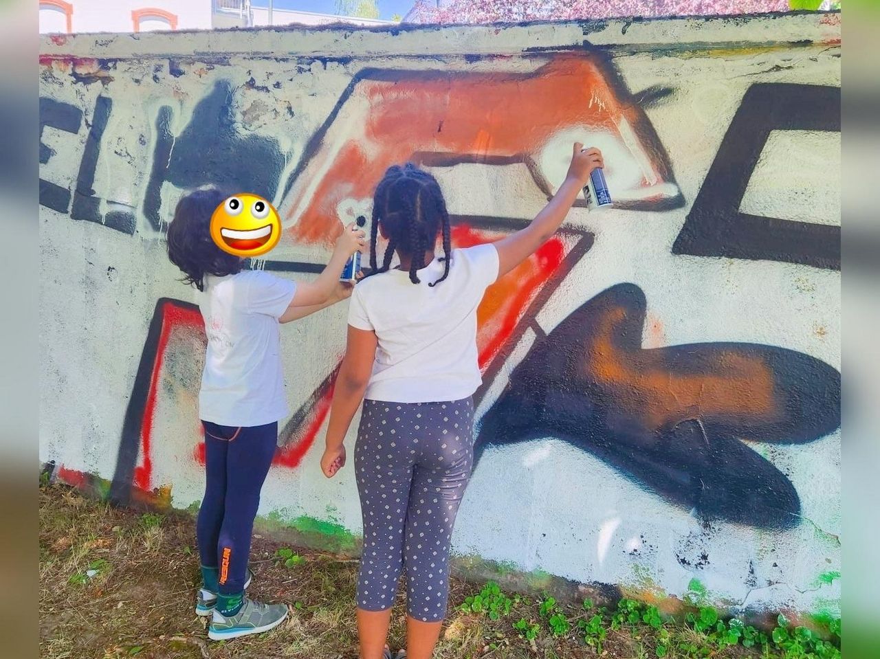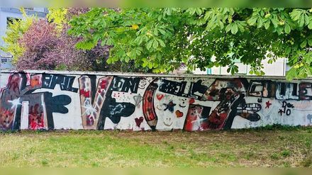 Die Mal AG hatte unter der Leitung von Herrn Conte am 07.07.23 die Möglichkeit, im Jugend- und Kulturzentrum Höchst die Wand mit Graffiti zu gestalten. Natürlich war das Motto schnell gefunden: Unsere Schule!