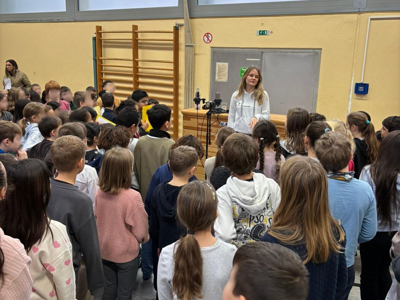 Gemeinsam mit den Minimusikern wurde daraufhin ein fröhlicher und mitreißender Song erarbeitet, der nicht nur Spaß macht, sondern unsere Schule auf wunderbare Weise beschreibt. Am 08.12.25 durften dann alle Kinder zusammen mit den Minimusikern das Lied aufnehmen. Das Ergebnis kann sich wirklich hören lassen – es ist großartig geworden, und wir freuen uns sehr darauf, es bald zum ersten Mal gemeinsam zu singen.